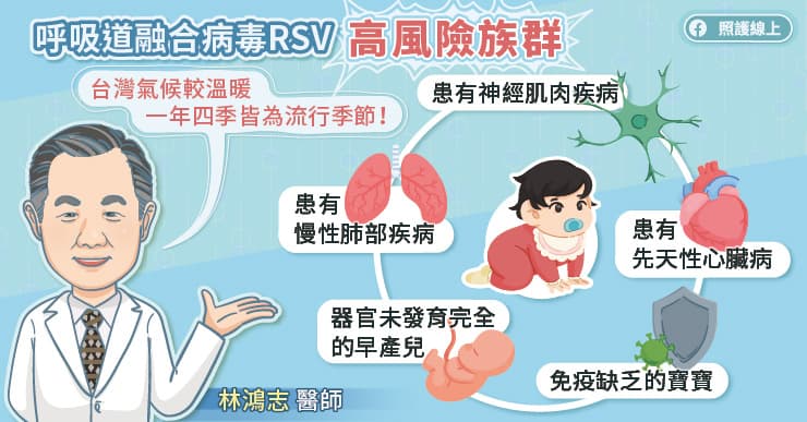 吸道融合病毒RSV的輕症患者也許3至5天就好了,重症患者便會拖比較久,林鴻志醫師說,早產兒、先天性心臟病、慢性肺病、神經肌肉疾病、免疫不全等,屬於高危險群,很容易演變成呼吸困難、呼吸衰竭。