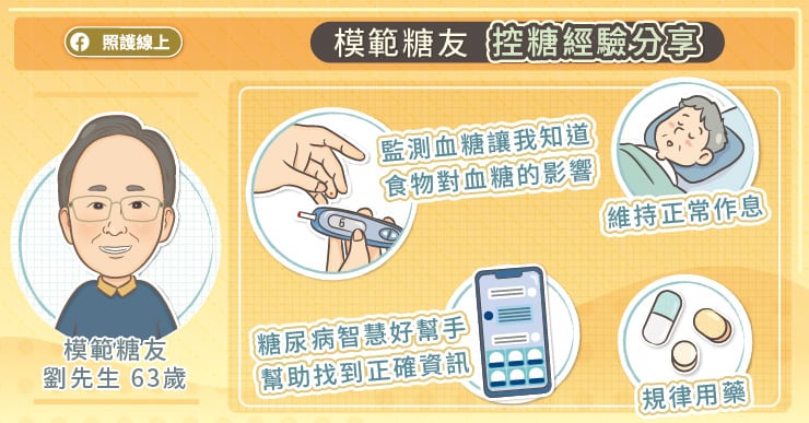 「診斷糖尿病已經超過20年,血糖控制穩定,也沒有發生我自己最擔心的心血管或是腎臟併發症。」63歲的模範糖友劉先生笑說,「要我回想我到底做了什麼厲害的事來控糖嗎?好像也沒有什麼大不了的!我的態度是,既然都要尋求醫療協助了,就要相信醫師專業和建議,按時服藥並測量血糖。」