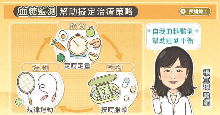 對於剛診斷糖尿病的病人,要從一開始就給予正確的自我管理疾病的觀念,在有好好的用藥治療情況下,從自我血糖監測、飲食控制、規律運動、按時服藥、定期檢查都要做重新檢視,勢必有些習慣需要做調整。楊宜瑱醫師說,血糖監測是其中一環,能夠幫忙糖友理解,他的生活習慣、飲食內容跟血糖的相關性。