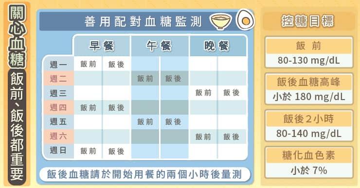 糖友可以採用「配對血糖監測」,週一驗早餐前後的血糖,週二驗午餐前後的血糖,週三驗晚餐前後的血糖,以此類推。記錄一段時間後,便能對三餐前後的血糖有較佳的掌握。