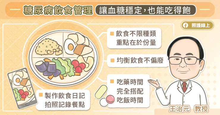 從一百年前開始,糖尿病的管理有三個重點,第一個重點是飲食,第二個重點是運動,第三個重點是藥物。中華民國糖尿病衛教學會理事長、臺大醫院內科部副主任王治元教授表示,以台灣糖尿病病人老化程度來說,要求病人做到非常完整而且有系統的運動,比較難達成,所以一定要把握飲食和藥物管理。