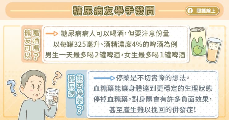 糖尿病病人可以喝酒,但要注意份量,王治元教授說,通常是計算酒精當量,1酒精當量相當於15公克酒精,以每罐325毫升、酒精濃度4%的啤酒為例,男生一天最多喝2罐啤酒,女生最多喝1罐啤酒;紅酒的酒精濃度約是啤酒的3倍,所以只能喝1/3的量。