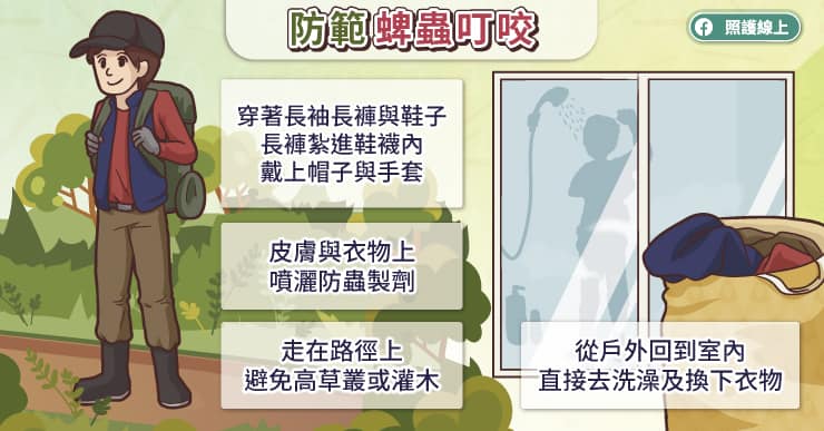 蜱蟲多在草地、灌木叢、和樹木繁茂的地區,只要我們要去郊外,就需要做好防護。於雜草叢生的地區,要穿著長袖長褲與鞋子,長褲紮進襪子或鞋子內,戴上帽子與手套,並在皮膚上與衣物上噴灑防蟲製劑。可以的話盡量不要挑無人走過的小徑,而要走鋪好的道路。