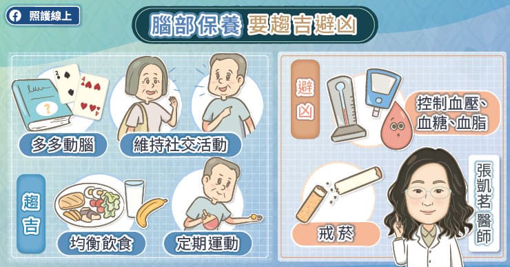 想要維護腦部健康,請務必趨吉避凶,張凱茗醫師說,「趨吉」的意思就是要多動腦,包括下棋、打牌、打麻將都可以。平時要多點人際互動,包括社交、對話,都是對腦部的訓練。