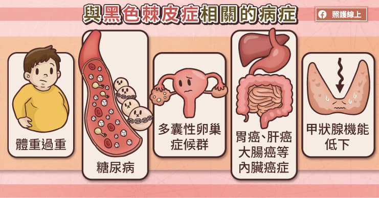 另外,黑色棘皮症甚至可能是癌症的徵兆之一,胃癌、肝癌、大腸癌等內臟器官長出惡性腫瘤時,還有淋巴瘤,都可能讓皮膚出現黑色棘皮症變化。總之,黑色棘皮症常常與健康狀況不良有關,需要多加注意與及早就醫。