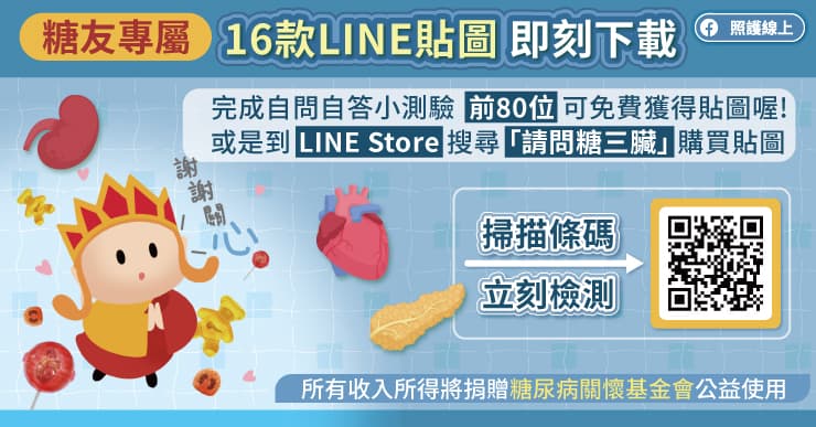 這16款的LINE貼圖圍繞血糖、腎功能、心臟功能來鋪陳,同時收錄一些值得關心的重點提醒病友。糖尿病關懷基金會的網站上有一個「請問糖三臟-自我檢測慢性腎臟病風險」的活動,完成檢測的糖友有機會獲得免費的「糖三臟」Line貼圖,數量有限,送完為止。