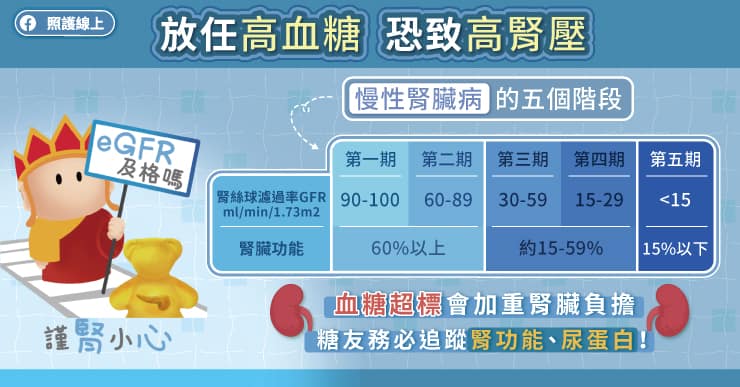 台灣的慢性腎臟病患,大概有一半是源自糖尿病。楊宜瑱醫師說,在糖尿病標準照護下,初期的慢性腎臟病,一年該檢測1至2次尿蛋白與腎絲球濾過率eGFR,如果進入中期、後期慢性腎臟病,就得更密集追蹤。糖尿病關懷基金會推出「請問糖三臟」活動,便是希望提醒糖尿病病患注意一些警訊,提升自我照顧的能力,務必定期追蹤腎功能及尿蛋白。