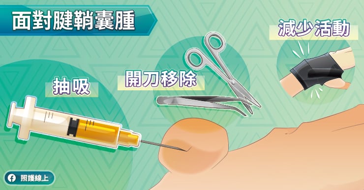 若腱鞘囊腫有造成痛、或影響外觀等症狀,可以先考慮「抽吸」。抽吸代表用針把腱鞘囊腫裡面的液體抽出來,因為沒有把整個囊腫移除,復發的機會比較高。一般如果腱鞘囊腫長在手的背面,是可以考慮先用抽吸的方式,減少囊腫裡面的壓力,再配合護腕等減少手腕活動的措施,會有機會改善腱鞘囊腫的大小。抽吸是門診即可完成的處置,患者不需住院。有些醫師會於抽吸的同時,打一點點類固醇進到囊腔內,但目前並沒有明確的研究顯示此舉能減少復發。