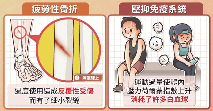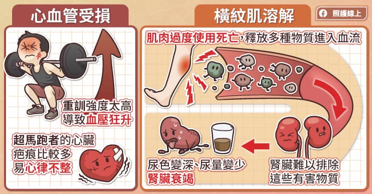 例如超級馬拉松這樣的長跑競賽,跑者需要跑80公里、100公里、160公里、或整整跑24小時等,對心血管系統產生了極端的需求,因而傷害心臟功能,影響心臟的節律和血管的狀況。若反覆做這件事情,心臟會因此出現疤痕組織。一篇研究發現,平均年齡為57歲,征戰過許多馬拉松、超馬比賽、以及鐵人三項的十二位跑者,與同齡但不運動者相比,鐵人們的心臟反而有纖維化與疤痕產生,長時間的訓練弱化了心臟肌力,導致更容易有來自心室的心律不整。
