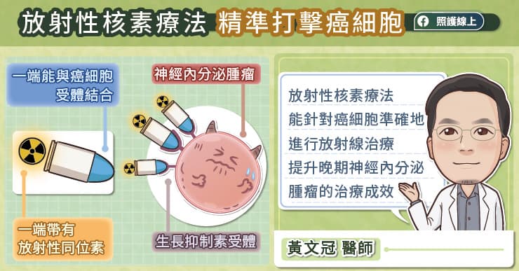 如果發現時已經無法開刀、或是轉移、復發等相對比較晚期的患者,就會需要全身性治療,但往往經過生長抑制素、標靶治療、化學治療後,疾病可能還是漸漸惡化。為了突破治療瓶頸,目前還可以使用放射性核素療法例如鎦。黃文冠醫師說,因為神經內分泌腫瘤常具有很豐富的生長抑制素受體,放射性核素療法便是將放射同位素與能夠和生長抑制素受體結合的藥物綁定在一起,如此一來,藥物就像精準導引的飛彈,一端能與神經內分泌腫瘤結合,一端能發出放射線,針對腫瘤細胞準確地進行放射線治療,有助於提升晚期神經內分泌腫瘤的治療成效。