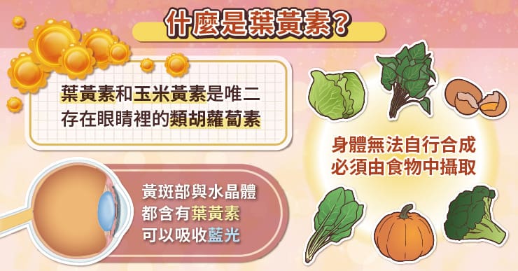 葉黃素是一種類胡蘿蔔素,在自然界中約有600多種類胡蘿蔔素,但在血清中大概只有20幾種。珍世明眼科診所王孟祺醫師指出,葉黃素和玉米黃素是唯二存在眼睛的類胡蘿蔔素,對我們的眼睛健康相當重要。眼睛的黃斑部與水晶體中都含有葉黃素,可以吸收藍光。