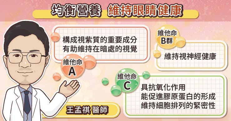 維他命B群跟維持視神經健康有密切的關係,王孟祺醫師說,因為眼睛具有大量神經,視神經是眼睛的重要結構。
