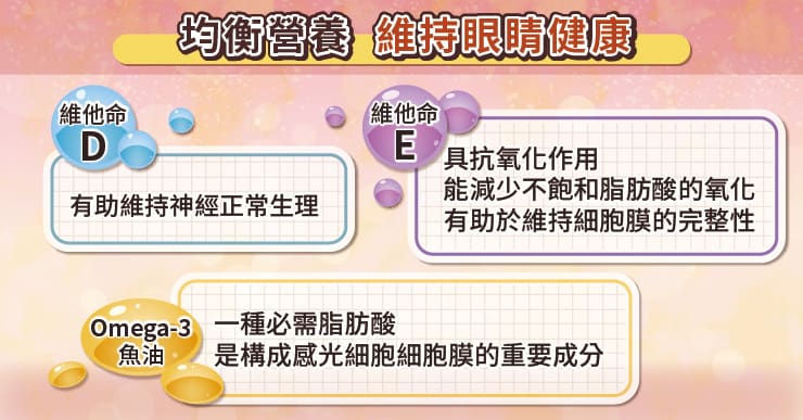 維他命E是脂溶性維他命,具抗氧化作用,能減少不飽和脂肪酸的氧化,有助於維持細胞膜的完整性。王孟祺醫師說,維他命E與視網膜裡面的脂肪酸代謝有關。維他命E之每日建議攝取量在一般成年人為12 mg(毫克)。