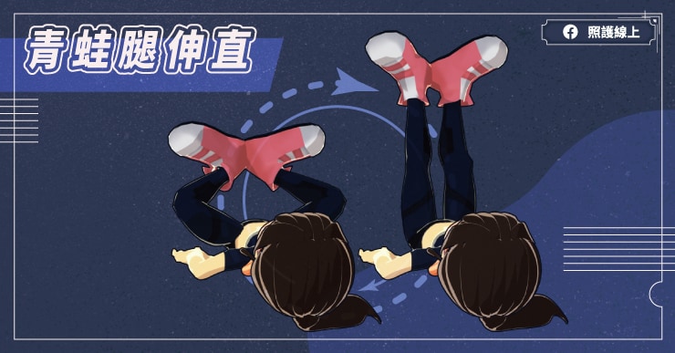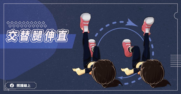 平躺在床墊或地墊上,雙腳彎曲讓髖部約呈九十度,試著將一腳往天花板方向伸直,停留片刻後收回,接著換往天花板方向伸直另外一腳。反覆練習。