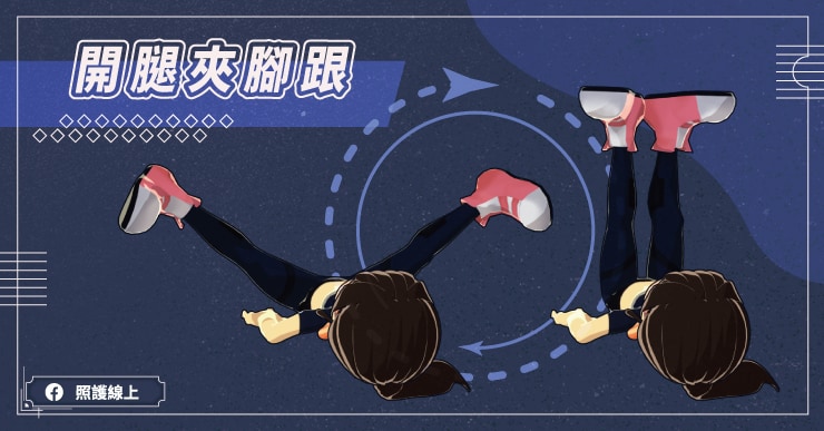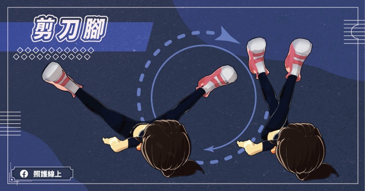 平躺在床墊或地墊上,雙腳彎曲讓髖部約呈九十度,兩腳伸直打開,腳背往下壓,接著兩腳靠近直到前後交叉,再打開,下次交叉時可以讓左右腳的前後位置互換,反覆練習。