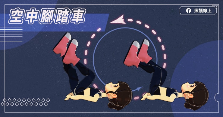 平躺在床墊或地墊上,雙腳彎曲讓髖部約呈九十度,先啟動右腳彎曲往下踩,再接續由左腳往下踩,輪流下踩的動作像是踩腳踏車般。