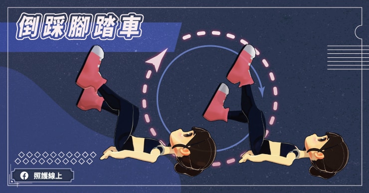 平躺在床墊或地墊上,雙腳彎曲讓髖部約呈九十度,先伸直右腳,勾腳跟,再彎曲膝蓋帶回右腳,同時伸直左腳,勾腳跟,再彎曲膝蓋帶回左腳。交替著像是倒踩腳踏車一般。