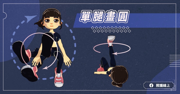 這個動作可以鍛鍊腿部肌肉的協調與肌力控制。一腳踩地,往天花板方向伸直另一隻腿。以大腿根部為圓心,整隻腿為半徑,開始畫圓,先往順時針方向練習幾圈後,再改成逆時針方向練習幾圈。
