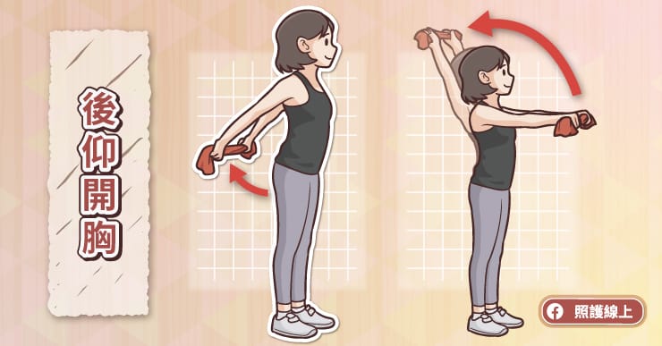先身體站直,兩腳距離與肩同寬,雙手在背部中間後方抓住毛巾的兩端,讓毛巾與地面平行,肩膀往後,直到感覺胸前的伸展,停留三十秒。接著,在胸前抓住毛巾的兩端,讓毛巾與地面平行,慢慢往上平移,直到雙手在耳後,身體微微後仰,感覺胸膛的開展。