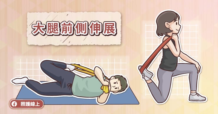 大腿前側的股四頭肌若是過於緊繃,很容易引起膝蓋痛,所以一定要好好伸展。可以是側躺,毛巾繞過上方那隻腳的腳背,以同側的手在身體後方抓住毛巾的兩端,感覺大腿前側股四頭肌的伸展。也可以呈跪姿,前腳膝蓋彎曲九十度,毛巾繞過後腳的腳背,同側的手往後抓住毛巾的兩端,或是當毛巾夠長的狀態下,可以讓毛巾越過肩膀,以同側的手抓住毛巾尾端,感覺大腿前側股四頭肌的伸展。