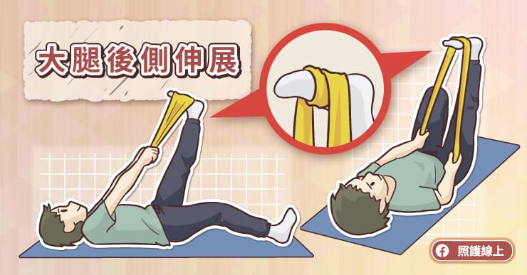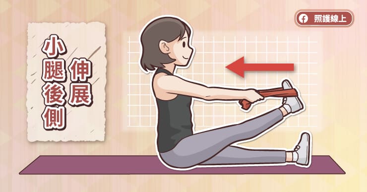 坐在地墊上,兩腿往前伸直,將毛巾繞過其中一腳的腳底(約莫在腳趾下方),兩手抓住毛巾的兩邊,出力將腳底往身體方向帶,過程中保持膝蓋、背部打直。