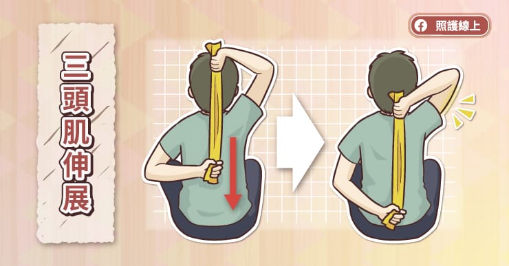 先用右手抓住毛巾的一端,往上往後甩,讓右手臂彎曲,手肘向上,握住毛巾的拳頭約在頸部後方,這時毛巾自然在背後下垂。左手手掌往後在腰部處抓住毛巾的另一端,將毛巾往下方帶,因此感覺右上方手臂的後方,也就是三頭肌處的伸展,維持三十秒後再換邊練習。