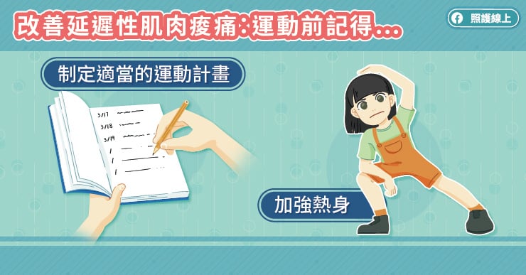 想要改善延遲性肌肉痠痛,可以在運動前花更長的時間做熱身。想想看,假使在肌肉還過度緊繃的時候直接做訓練,受傷的機會當然會比較大;如果花多一點時間,先讓身體做一些大關節的簡單動作,並且讓心律上升,血流加速,身體熱起來,肌肉受傷的機會就比較小。
