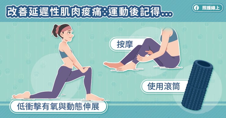 記得,千萬不要躁進,再怎麼熱愛健身,都要讓身體習慣新的強度,也讓身體有時間做些好好的修復;我們運動的目的是要真實的身體與心理健康,而不是追求健美健體的型態與數據。而假使如果肌肉痛的時間過長,已經超過一個星期,或有局部紅、腫、熱,代表事情不是延遲性肌肉痠痛這麼簡單,最好要趕快找醫師診治。