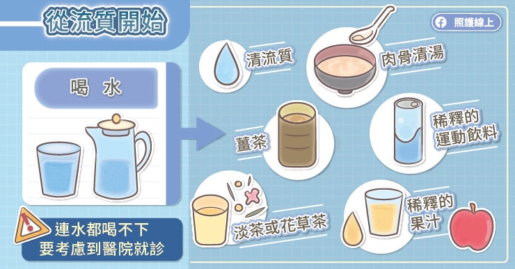 至少要喝水,萬一連水都喝不下,會有脫水的危險,要考慮到醫院就診。如果還可以喝水,請多喝一些。
