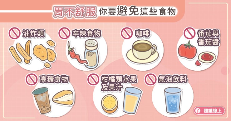 這時候務必要避免高糖分、高油脂的速食、加工肉類、甜品,或者是容易刺激胃酸分泌的食物,含有較高量不可溶纖維的蔬菜、全穀類也不適合,都會更容易導致脹氣和腸胃不適。