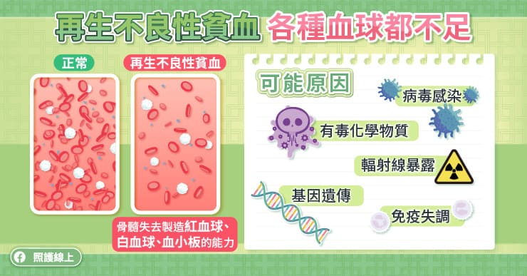 再生不良性貧血是個相對少見但嚴重的疾病,血液中的紅血球、白血球、血小板都會明顯缺乏,而導致臉色蒼白、心跳加速、呼吸急促、容易疲倦、出血不止、容易感染等問題。