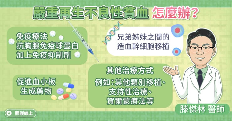 如果是40歲以下的患者,可以考慮做兄弟姊妹之間HLA完全吻合的造血幹細胞移植(骨髓移植)。滕傑林醫師說,如果是40歲以上,或是找不到合適的造血幹細胞捐贈者,可以使用免疫療法。而接受免疫療法,平均要3、4個月後才知道有沒有效,滕傑林醫師說,在這段時間患者還是有感染、出血的風險需特別小心。