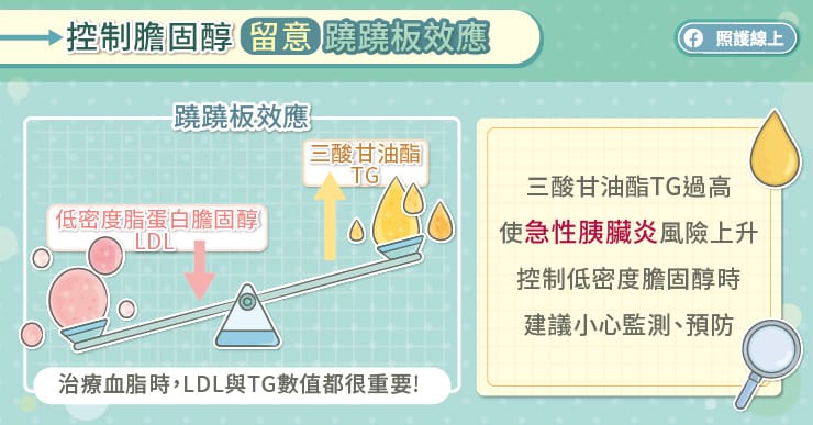 使用藥物控制膽固醇時,經常會發現蹺蹺板效應,陳柏蒼醫師解釋,因為在代謝過程中,低密度脂蛋白膽固醇LDL與三酸甘油酯TG是上、下游的關係,所以在低密度脂蛋白膽固醇LDL下降時,三酸甘油酯TG會有上升的情形,類似蹺蹺板,所以被稱為「蹺蹺板效應」。