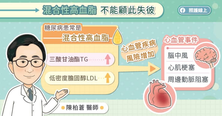 代謝症候群逐漸惡化之後,除了造成糖尿病,還會伴隨高血脂、高血壓。糖尿病患的高血脂往往是混合性血脂異常,除了注意低密度脂蛋白膽固醇LDL,還要注意三酸甘油酯TG。陳柏蒼醫師說,臨床上會希望把低密度脂蛋白膽固醇LDL控制好,而且三酸甘油酯TG也不可忽視。因為三酸甘油脂太高,會產生急性胰臟炎,亦可能增加心血管疾病的風險,所以都必須注意,才能避免後續嚴重的併發症。