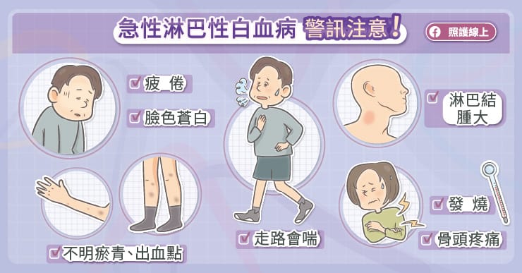 急性淋巴性白血病是種急性血癌,可能影響正常血球的功能,而造成貧血、臉色蒼白、反覆發燒、容易瘀青出血等症狀。若發現相關警訊,請務必盡快至血液腫瘤科就診。