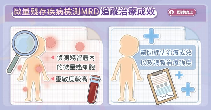 在治療過程中會監測病人的反應,例如抽骨髓,看看癌細胞的比例,現在還可使用「微量殘存疾病檢測(Minimal Residual Disease,MRD)」。蕭惠樺醫師解釋,微量殘存疾病檢測MRD運用流式細胞儀或次世代基因定序,可偵測到殘留在體內微量的癌細胞,讓醫師評估治療成效,並可根據檢測結果適時調整治療強度。