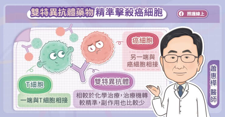 雙特異抗體藥物是一種免疫球蛋白,免疫球蛋白的結構像一個Y,具有兩個端點,蕭惠樺醫師說,雙特異抗體藥物的設計是讓免疫球蛋白的一端與T細胞相接,另一端與癌細胞相接,如此一來患者的T細胞就能對癌細胞發動攻擊。