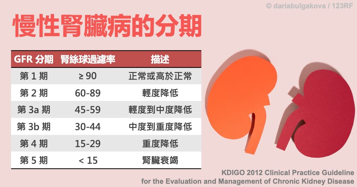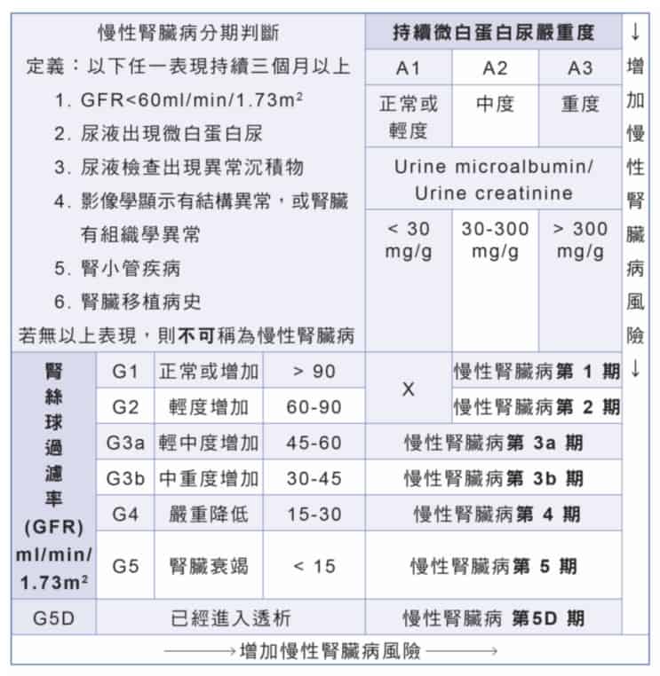 若要診斷為慢性腎臟病第一期(eGFR ≧ 90)或第二期(eGFR 60~89),則必須同時合併腎臟結構異常,如蛋白尿等。
