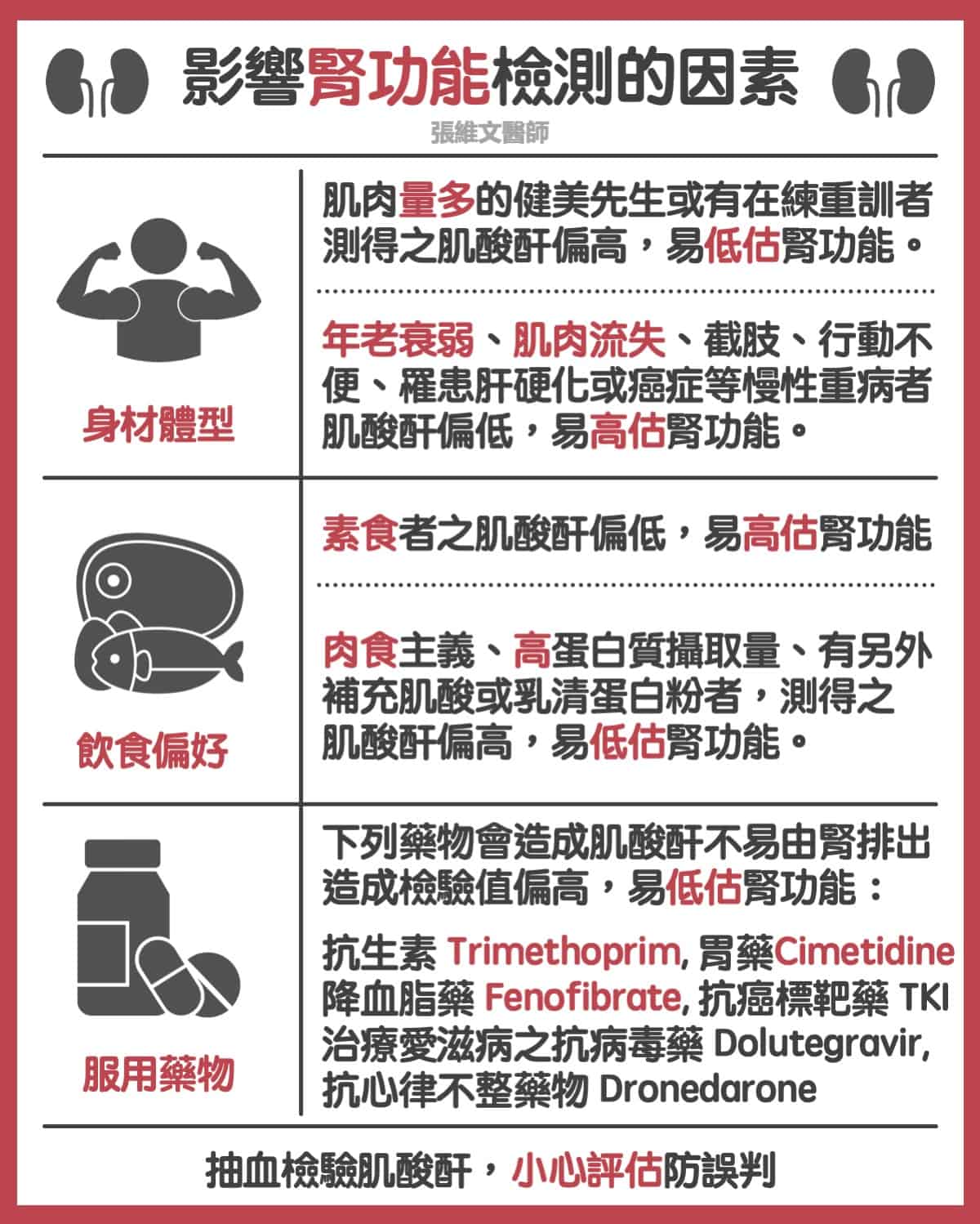 • 有在服用某些會抑制腎小管分泌肌酸酐的藥物,如胃藥 H2 blockers、降三酸甘油脂的 Fibrate 類藥物、抗生素 Trimethoprim 等。