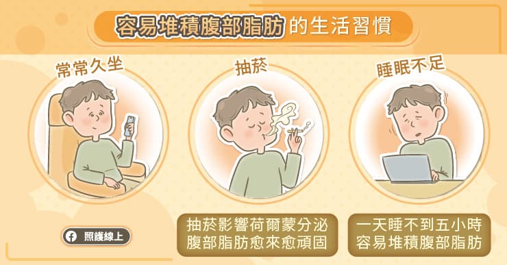 若家人間有類似的狀況,我們常常會把原因歸咎於體質或基因;然而,家人間也常常會有類似的生活習慣,導致了類似的身體狀況。所以,可能是習慣出了問題,讓我們在不知不覺之間,累積更多腹部脂肪,若不改掉這些壞習慣,腹部脂肪比其他位置的脂肪都還麻煩,所以我們趕快來看看究竟是哪些壞習慣會讓人累積腹部脂肪吧。延伸閱讀:五招打擊腹部脂肪,拒當小腹人