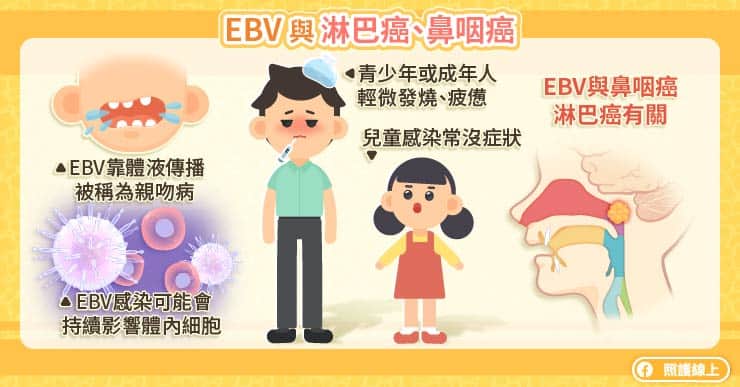 EBV是皰疹家家族中的一員,通常靠著體液傳播,因此唾液是最常見的傳播介質,所以EBV的感染會被稱為「親吻病」。除了親親嘴會導致EBV傳染之外,咳嗽、流鼻水、共用碗盤或杯具,也都會傳染EBV。