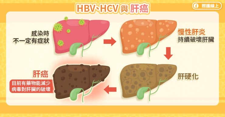 感染B型肝炎病毒與C型肝炎病毒後,不一定會有症狀,因此許多人連自己被感染了都不知道;有些有症狀的患者,可能就是較倦怠、疲憊、或有點噁心感,或發生黃疸,但通常也都會康復。然而,HBV與HCV最麻煩的不是造成急性感染症狀,而是病毒留在肝臟引發慢性感染,讓肝臟會持續地受到長時間破壞,不停地發炎,肝臟功能逐漸失調,演變成肝硬化,最後變成肝癌。