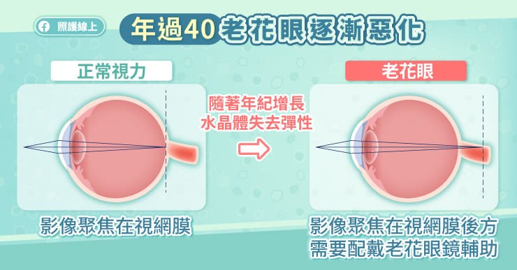 一般而言,到40歲開始會有老花眼,不過其實在35歲左右,有人就會開始出現有輕微的老花症狀。李原傑醫師說,例如在追蚊子的時候,追一追就忽然找不到了,這是因為眼睛對焦的速度變慢,而無法精準追蹤蚊子飛行的路徑。後來,不只調節變慢,而且能夠調節的程度也變小,老花眼的症狀就越來越明顯。關於老花眼的成因有很多學說,其中自然水晶體硬化是很重要的原因。