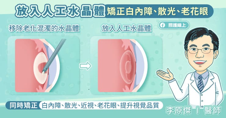 每個人的工作、生活型態不同,對於視力的需求也不同,李原傑醫師說,如果白內障已經嚴重影響視力,便可考慮接受白內障手術。白內障手術是把混濁的水晶體移除,然後放入一個新的人工水晶體,讓光線可以順利通過。