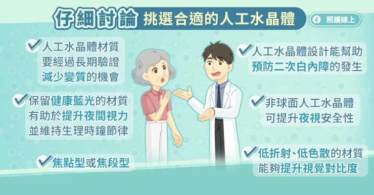在材質方面,可選擇經過長期驗證的材質,減少變質的機會。透過晶體設計,可降低二次白內障的發生。低折射、低色散的材質,能夠提升視覺對比度,非球面人工水晶體有助於提升夜視安全性。保留藍光的材質,有助於提升夜間視力並維持生理時鐘節律。