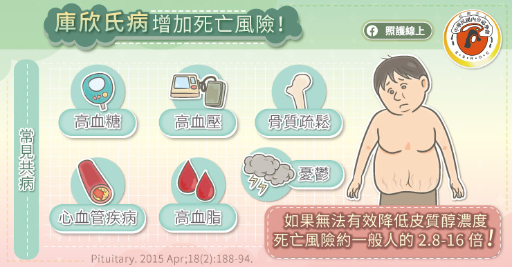 「出現庫欣氏病時,一定要積極處理,」陳玟潔醫師說,「如果沒辦法有效降低皮質醇濃度的話,死亡風險可能高達一般人的2.8至16倍!」