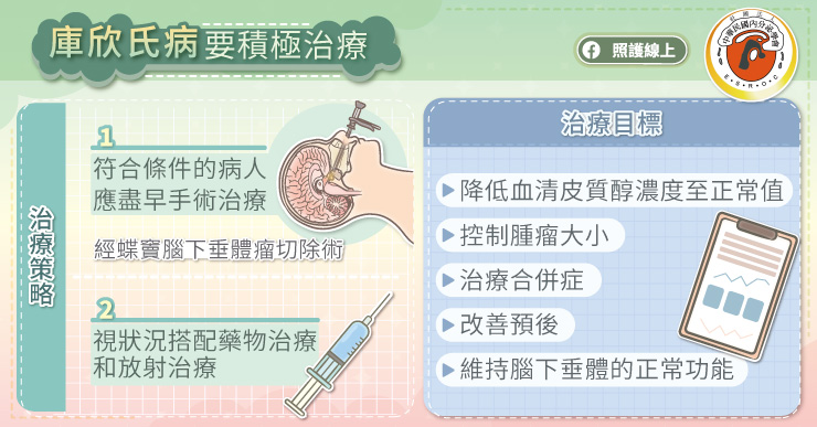經過一系列檢查,證實有腦下垂體腫瘤造成皮質醇分泌過多,便可診斷為庫欣氏病。陳玟潔醫師說,針對庫欣氏病,手術是治療的首選。目前的主流是微創手術,神經外科醫師會利用內視鏡,經由鼻腔穿過蝶竇,進行腦下垂體腫瘤切除術。臺大醫院的研究顯示,手術後的緩解率可以超過八成。陳玟潔醫師說,剛開完刀一週內,患者體內的荷爾蒙尚未穩定,因此要特別留意是否有不足並適時補充。