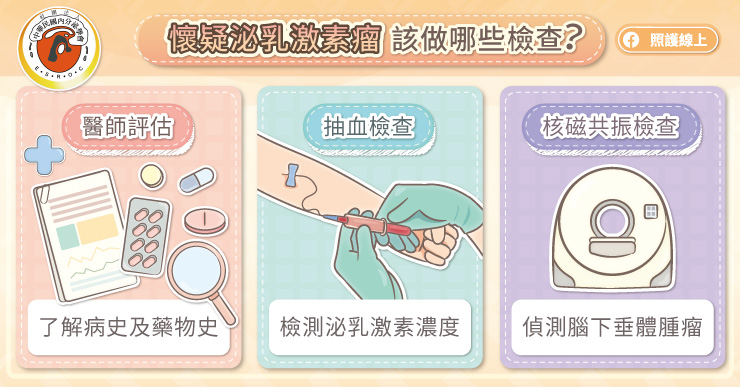 在懷疑泌乳激素瘤時,應透過血液檢查、影像學檢查和臨床醫師的評估來診斷。
