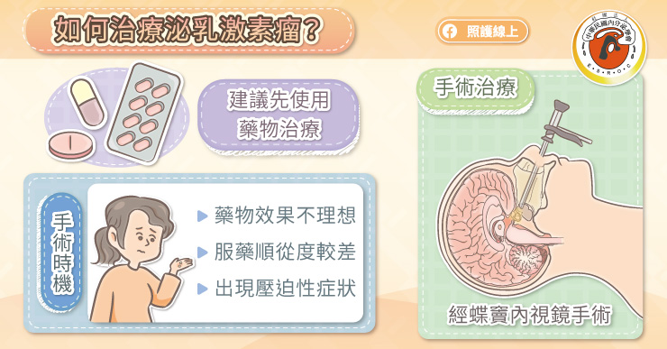 與其他腦下垂體腫瘤不同的是,泌乳激素瘤的首選治療方式是藥物治療。林思涵醫師說,泌乳激素瘤對藥物治療的反應很好,優先採取藥物治療。但是,當藥物治療效果不佳、服藥順從性較差、不願意長期服藥、腫瘤較大、或出現危急狀況(例如腫瘤出血的腦垂體中風、視野缺損)時,便要考慮轉介給神經外科醫師評估手術切除腦下垂體腫瘤。