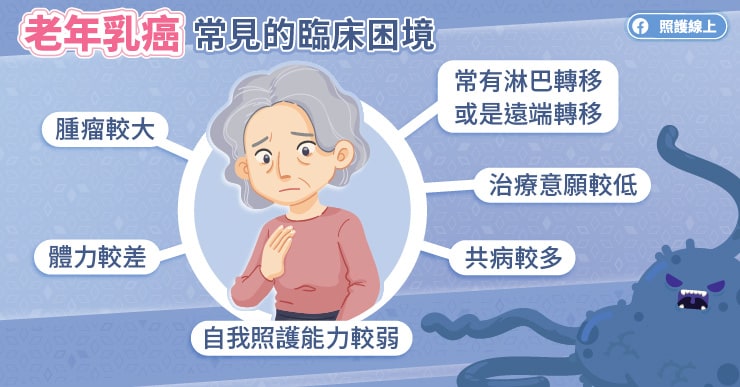 乳癌是女性最好發的癌症,而老年乳癌患者常會在較晚期才發現,腫瘤已經比較大顆或發生遠端轉移。李楊成醫師說,由於老年患者的體力較差、共病較多、自我照護能力較弱,在進行治療時往往有更多的考量與限制。
